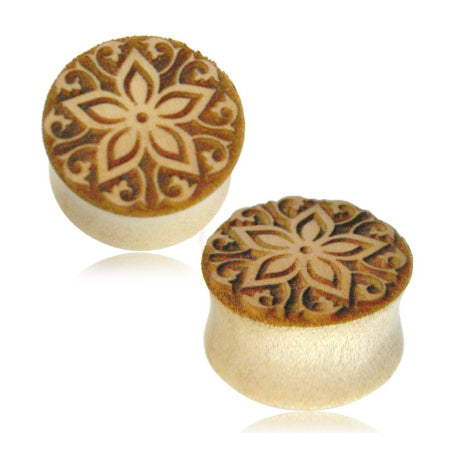 These double flare flower engraved plugs are made from crocodile wood. They have a wearable area of 3/8" between flares. Choose your size below.