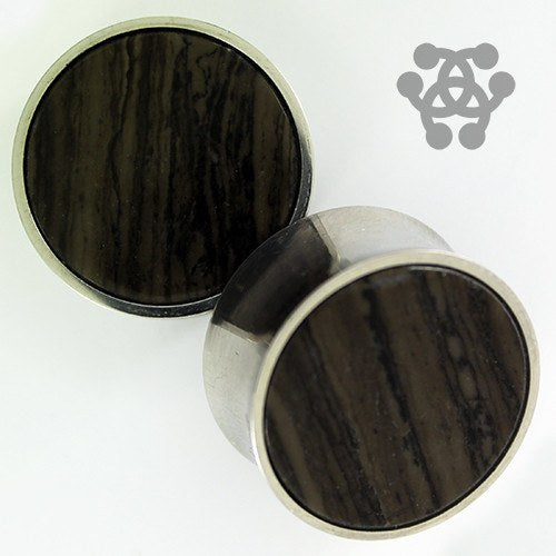 These double flare plugs are made from heavy wall 316L stainless steel with inset fossil wood. They have a wearable area of 3/8" between flares. These are hollow on the backside and relatively lightweight. Choose your size below.