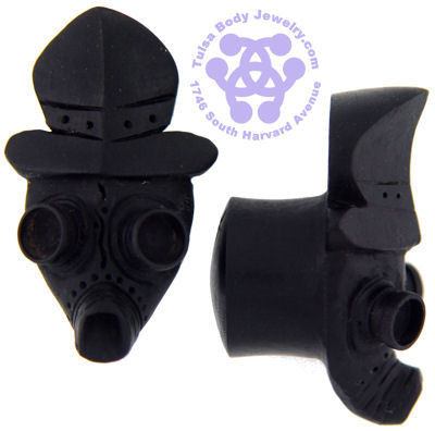 These double flare gas mask plugs are handcarved from arang wood by Urban Star Organics. They have approximately 3/8" wearable area between the flares. Choose your size below.