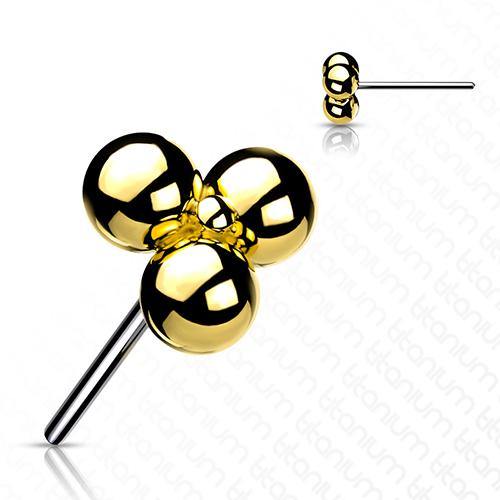 The threadless ball trio end is made from gold PVD coated grade 23 titanium (Ti 6Al-4V ELI ASTM F136). It measures approximately 2.9mm high x 3.1mm wide. It has a 25g pin that is compatible with most threadless jewelry brands.