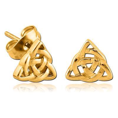 These 20 gauge celtic knot stud earrings are made from gold PVD coated cast 316L stainless steel.