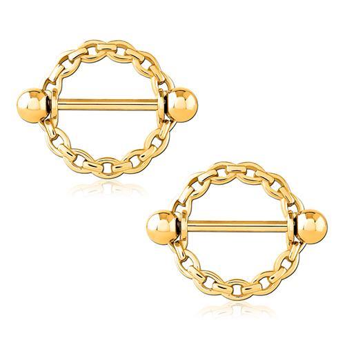 These 14 gauge chain nipple shields are made from gold PVD coated 316L stainless steel with an interior diameter of 9/16". The 14g straight barbells are made from 316L stainless steel with external threading.
