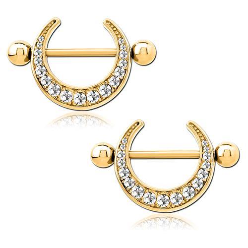 These cz crescent nipple shields are made from gold PVD coated 316L stainless steel. The 14 gauge straight barbells are made from gold plated 316L stainless steel with external threading. The gems are available in clear only. Choose your size below.