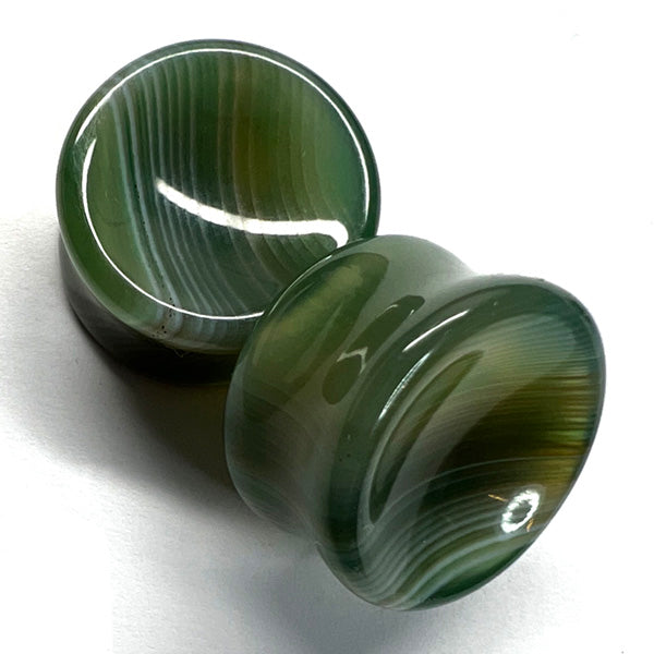 These double flare concave green line jasper plugs have a wearable area of 3/8" between flares. Choose your size below.