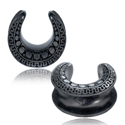 These ornate saddle spreaders are made from gun metal. They have a wearable area of 5/16" between flares. These should fit so long as your lobes can handle large flares, but many customers prefer these one smaller size than the plug size they normally wear. Choose your size below.