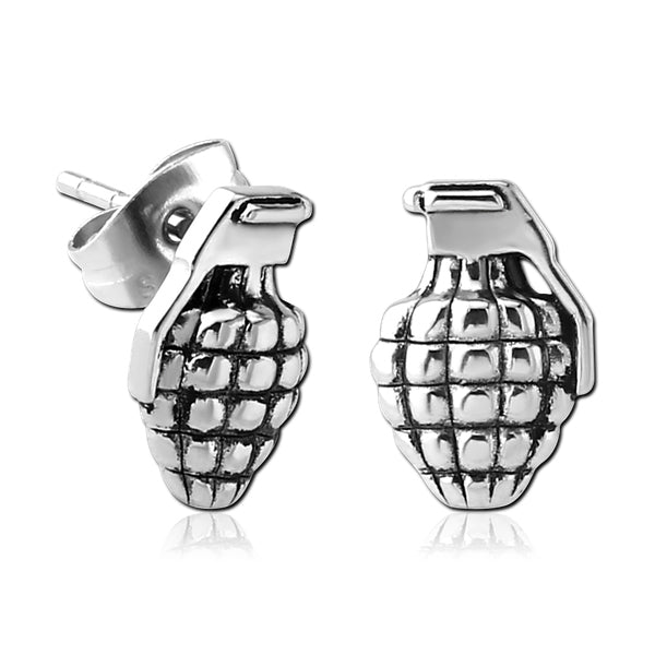 These 20 gauge hand grenade stud earrings are made from cast 316L stainless steel.