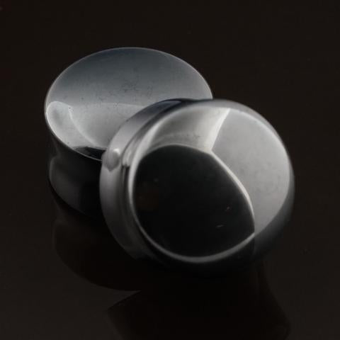 These double flare hematite plugs are made by Diablo Organics. They're rounded on one side and flat on the other with a wearable area of 7/16" between flares. Choose your size below.