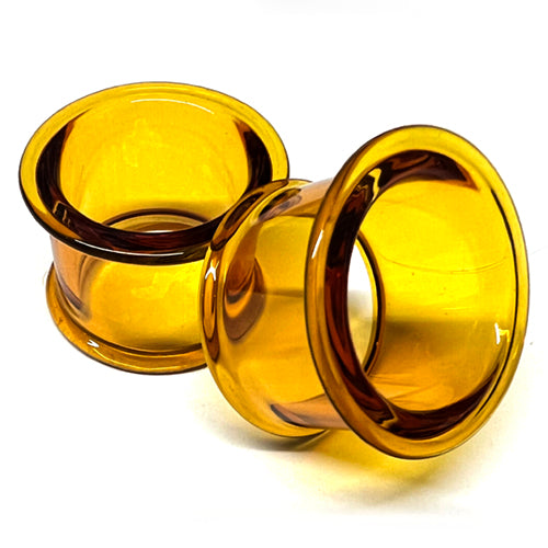 These double flare honey bullet holes are made from hand blown borosilicate glass by gorilla glass. Size availability is limited by the availability of raw material (glass tubing). These are only available in the specific sizes we have listed here. Our product photos show the 3/4" and beautiful fitted box that's included for sizes 1/2" and larger. Choose your size below.