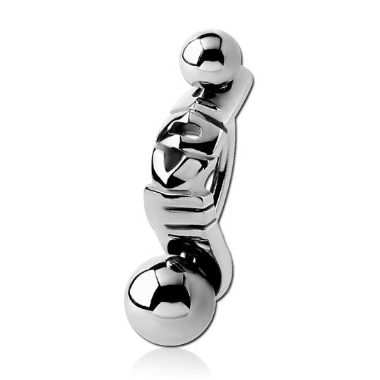 The 14 gauge 15/32" curved barbell is made from 316L stainless steel with external threading. The love shield is also made from solid steel, but note that it reduces the wearable area of the curved barbell to 5/16".