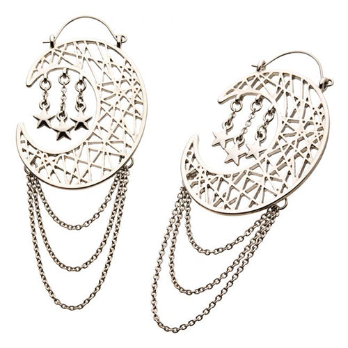 These 20 gauge moon and stars hoop earrings have a bright silver finish. The hinged post is made from 316L surgical steel. They can be worn as regular earrings, but the oversize design is intended to fit comfortably inside most flesh tunnels. Sold as a pair.