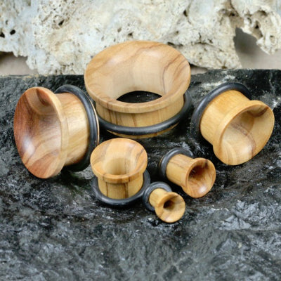 These single flare tunnels are made from olive wood. They have a wearable area of 5/16" between the o-ring and flare. They're grooved on the end to hold the o-rings more securely. Two black o-rings are included. Choose your size below.