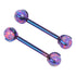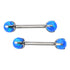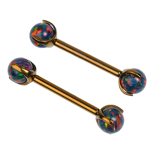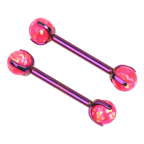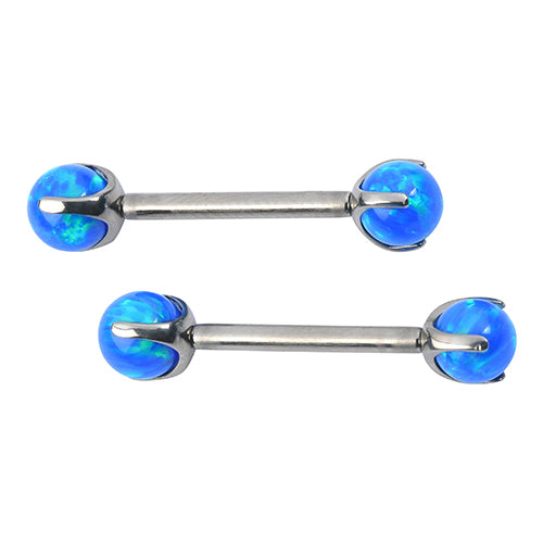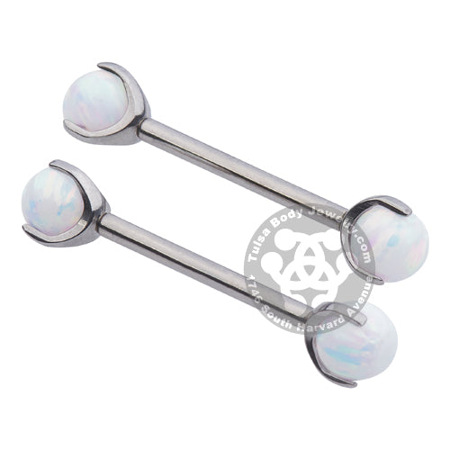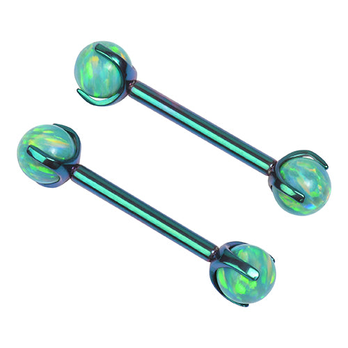 These 14 gauge nipple barbells are made from high polish grade 23 titanium (Ti 6Al-4V ELI ASTM F136) with internal threading. Both 5mm prong-set opal ball ends are removable. These cannot be returned or exchanged if you select a custom anodized barbell color. Only the high polish (plain silver) is eligible for our return policy. Choose your size and color below.