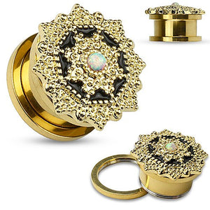 These screw-on plugs are made from gold PVD coated 316L stainless steel. The tribal shield has a white resin imitation opal. They have a wearable area of 1/4" between flares. Choose your size below.