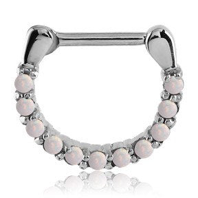 The 16 gauge opal septum clicker is made from 316L stainless steel. The 5/16" long barbell is hinged on one side and snaps firmly shut on the other. The interior diameter is measured inside the clicker from top to bottom. Choose your synthetic opal color below.