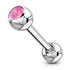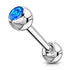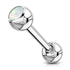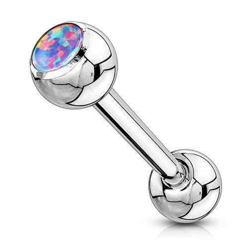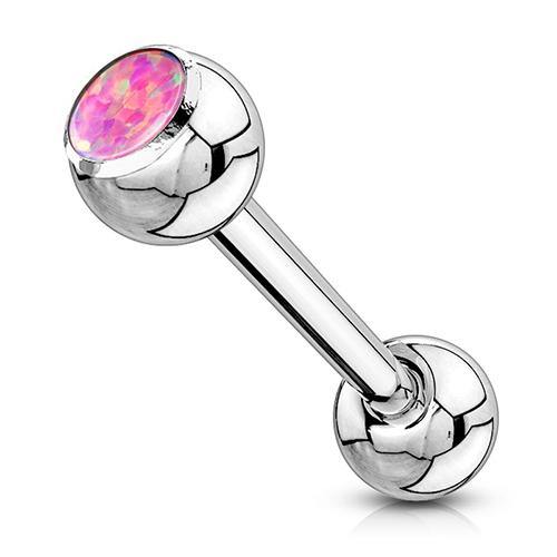 The 14 gauge opal tongue barbell is made from 316L stainless steel with external threading. The top ball is bezel set with a synthetic opal and both ends are removable. Choose your color below.