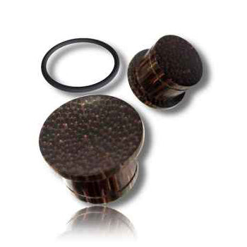 These single flare plugs are made from palm wood. They have a wearable area of 5/16" between the o-ring and flare. They're grooved on the end to hold the o-rings more securely. Two black o-rings are included. Choose your size below.