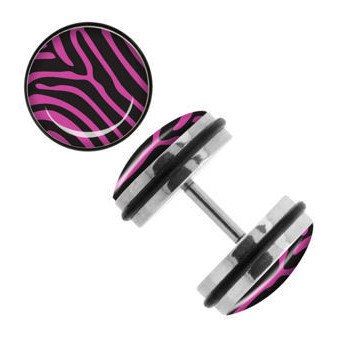 The 18 gauge pink zebra fake plugs are made from 316L stainless steel with external threading. The logo is encased in a clear acrylic dome. These are sold as a pair.