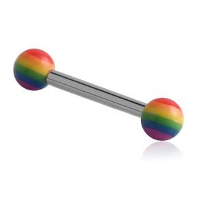 The 16 gauge rainbow cartilage barbell is made from 316L stainless steel with external threading. Both 3mm striped acrylic balls are removable.