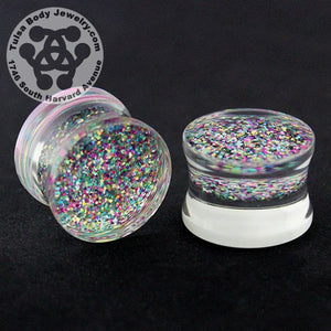 These double flare plugs are made from rainbow glitter encased in clear acrylic. They have a wearable area of 7/16" between flares. Choose your size below.