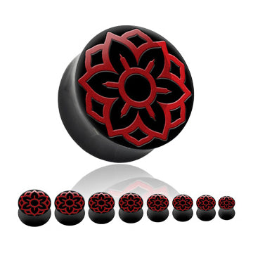 These double flare lotus plugs are made from handcarved water buffalo horn with crushed red bone inlay. These are available in size 5/8" only.