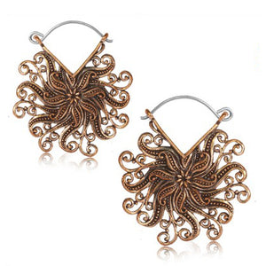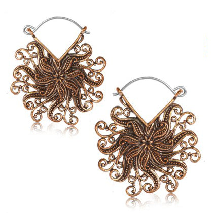 These 20 gauge floburst earrings are cast from solid rose brass and approximately 1-3/8" tall x 1-5/8" wide. The wearable wire is made from sterling silver.