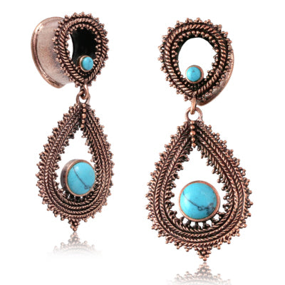 These double flare plugs are made from solid rose brass and turquoise. Please take notice these tunnels have an unusual reverse-teardrop shape. They have a wearable area of 5/16" between flares. Choose your size below.
