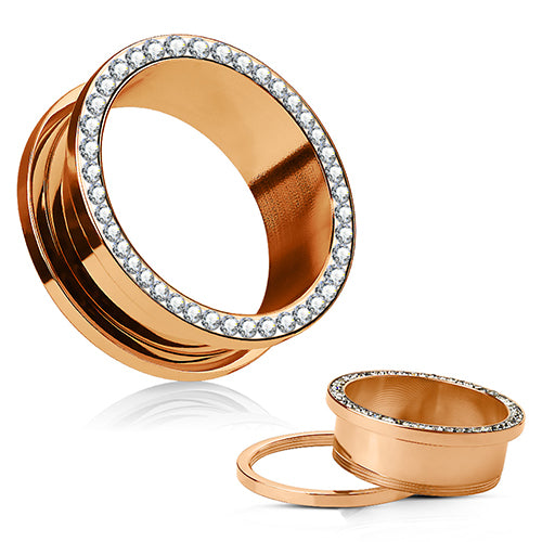 These screw-on cz tunnels are made from rose gold PVD coated 316L stainless steel with external threading. They have a wearable area of 5/16" between flares. The back side unscrews for easy insertion. Choose your size below.