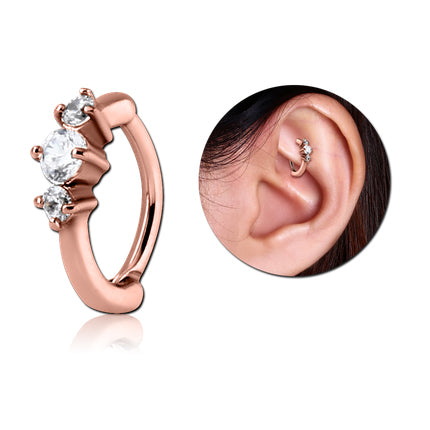 The 16 gauge cz paved cartilage clicker is made from rose gold PVD coated 316L stainless steel with an interior diameter of 1/4". The curved barbell is 5/16" long, hinged on one side and snaps firmly shut on the other.