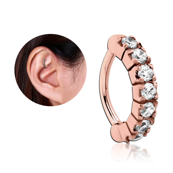 The 16 gauge cz paved cartilage clicker is made from rose gold PVD coated 316L stainless steel with an interior diameter of 1/4". The curved barbell is 5/16" long, hinged on one side and snaps firmly shut on the other.