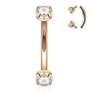 The 16 gauge cz curved barbell is made from rose gold PVD coated 316L stainless steel with internal threading. Both 3mm prong-set ends are removable.