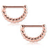 These 14 gauge twisted nipple clickers are made from rose gold PVD coated 316L stainless steel. The barbell is hinged on one side and snaps firmly shut on the other.