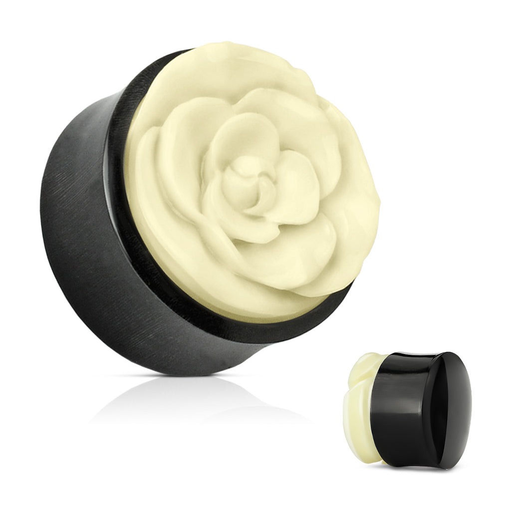 These double flare rose plugs are made from handcarved water buffalo horn with bone inlay. Choose your size below.