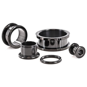 These screw-on tunnels are made from black PVD coated 316L surgical grade stainless steel with external threading. They have a wearable area of 1/4" between flares. The back side unscrews for easy insertion. Choose your size below.