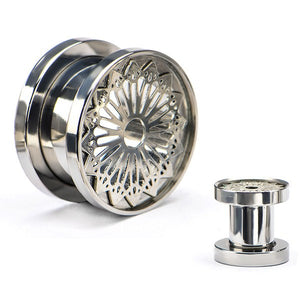 These screw-on mandala zen tunnels are made from 316L stainless steel with external threading. They have a 1/4" wearable area between flares. The back side unscrews for easy insertion. Choose your size below.