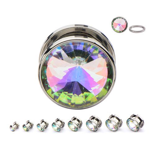 These screw-on aurora borealis cz plugs are made from 316L stainless steel with external threading. They have a wearable area of 1/4" between flares. Choose your size below.