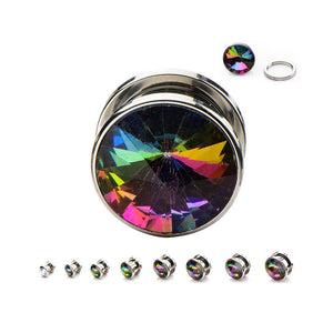 These screw-on vitrail cz plugs are made from 316L stainless steel with external threading. They have a wearable area of 1/4" between flares. Choose your size below.