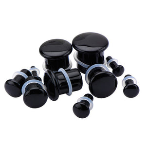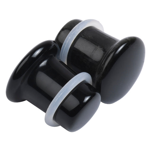 These single flare black agate plugs have a wearable area of 3/8" between the o-ring and flare. Two clear silicone o-rings are included. Choose your size below.