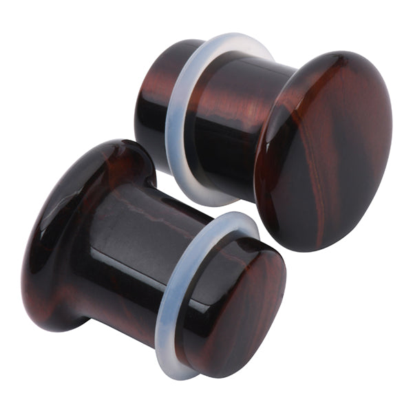 These single flare red tiger eye plugs have a wearable area of 3/8" between the o-ring and flare. Two clear silicone o-rings are included. Choose your size below.