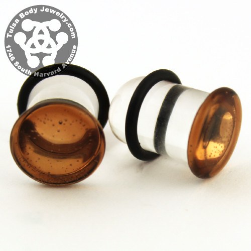 These single flare sienna color front plugs are made from hand blown borosilicate glass by glasswear studios. They have approximately 3/8" wearable area between the flare and o-ring. Two o-rings are included. Choose your size below.