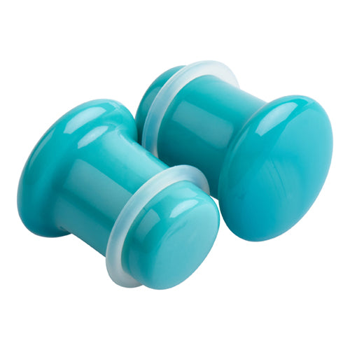 These single flare convex plugs are made from opaque teal glass. They have a wearable area of 3/8" and come with a pair of clear silicone o-rings. Choose your size below.