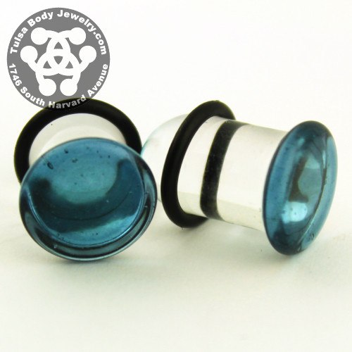 These single flare translucent sparkle blue color front plugs are made from hand blown borosilicate glass by glasswear studios. They have approximately 3/8" wearable area between the flare and o-ring. Two o-rings are included. Choose your size below.