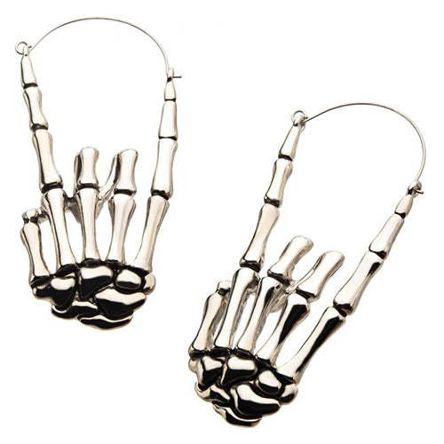 These 20 gauge skeleton hand hoop earrings have a bright silver finish. The hinged post is made from 316L surgical steel. They can be worn as regular earrings, but the oversize design is intended to fit comfortably inside most flesh tunnels. Sold as a pair.