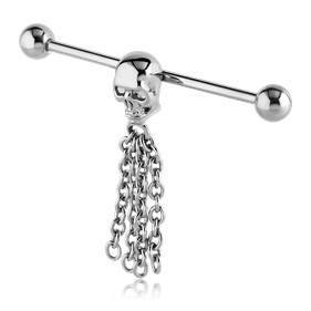 The 14 gauge skull and chains dangle industrial barbell is made from 316L stainless steel with external threading. The charm is fixed to the barbell.