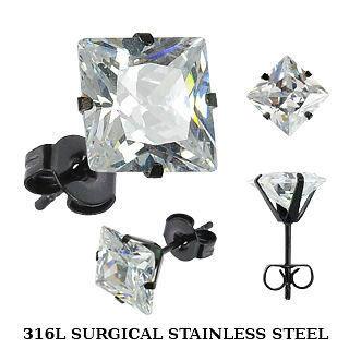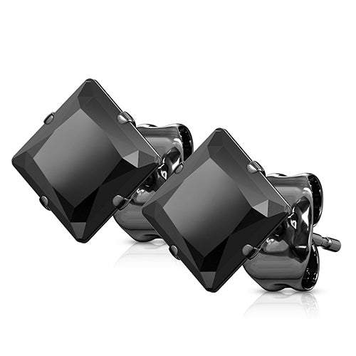 These 22 gauge stud earrings are made from black PVD coated 316L stainless steel with square CZs. Choose your gem size and color below.