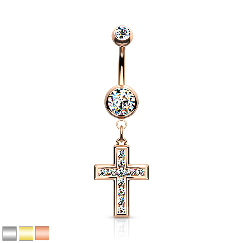 The 14 gauge cross cz dangle belly barbell is made from 316L stainless steel with external threading. Only the 5mm ball end is removable. Choose your finish below.