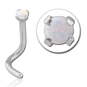 The nostril screw is made from 316L stainless steel with 1/4" wearable area. The 2mm prong-set synthetic opal is available in white only.