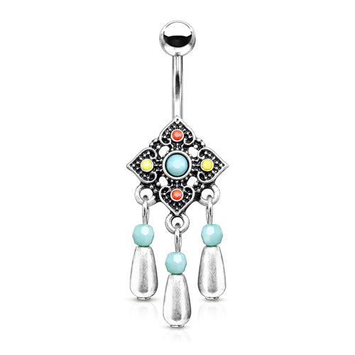 The 14 gauge square flower belly dangle is made from 316L stainless steel with external threading. Only the top 5mm ball is removable.