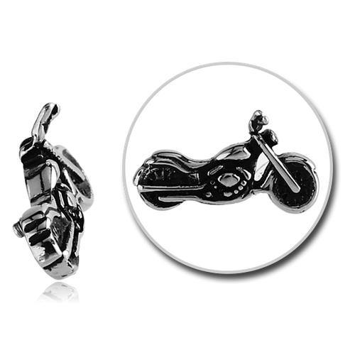 The 14 gauge motorcycle is made from 316L stainless steel. It measures 11.7mm wide x 6.5mm high. These will fit most any 14 gauge internally threaded straight barbell, labret or dermal anchor. We cannot guarantee compatibility with curved barbells.