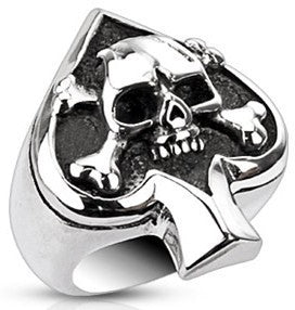 The skull spade ring is cast from 316L stainless steel and polished to a mirror finish. The ring is 1.22" wide and available in sizes 6 through 13.