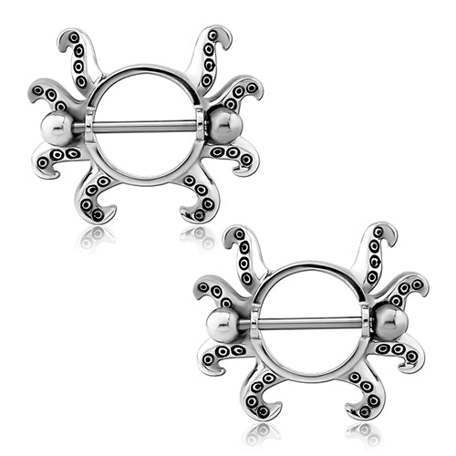 These 14 gauge tentacle nipple shields are made from 316L stainless steel with an interior diameter of 9/16". The 14g 5/8" straight barbells are externally threaded.